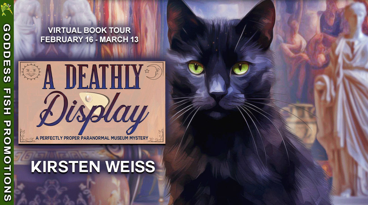 Goddess Fish Promotions is organizing a Virtual Book Tour for A DEATHLY DISPLAY by Kirsten Weiss, a cozy mystery available February 17 from Misterio Press. The tour will run February 16 – March 13, and Kirsten Weiss is available for guest post and interviews. A PDF or epub copy of the book is available for review in conjunction with a guest post or interview.