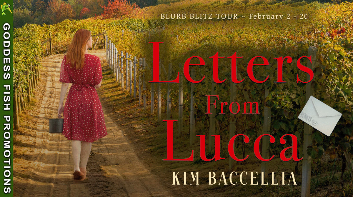 Goddess Fish Promotions is organizing a Virtual Blurb Blitz Tour for LETTERS FROM LUCCA by Kim Baccellia, a historical fiction available February 3. The tour will run February 2 – February 20, and this tour will not include interviews or guest blogs; however, a blurb, excerpt and author bio will be provided to every host for inclusion on their blog. A PDF or epub copy of the book is available for review.